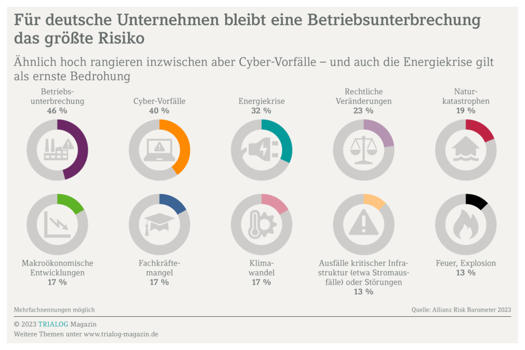 Unternehmerinnen und Unternehmer hierzulande sind besorgt über eine drohende Energiekrise oder einen eventuellen Cyber-Angriff. Doch als größte Gefahr für ihren Betrieb sehen sie allgemein das Risiko einer Betriebsunterbrechung. 46 Prozent der für das Allianz Risk Barometer befragten Makler, Risikoberaterinnen und Schadenmanager bezeichnen sie als Topthema. Zwar hat sich dieser Anteil gegenüber dem Jahr 2022 reduziert, die Betriebsunterbrechung landete damals mit 55 Prozent auf Platz Eins. Allerdings erscheinen durch den Krieg in der Ukraine und die damit verbundenen Effekte – mehr Cyber-Angriffe sowie womöglich nicht gesicherte Strom- und Gasversorgung – diese Risiken plötzlich konkreter als früher, was sich im Umfrageergebnis niederschlägt. Zudem steht hinter der Furcht vor einer Energiekrise oder einem Cyber-Angriff immer auch die Angst, dadurch könnte ein Betriebsunterbrechungsschaden entstehen. Selbst fortlaufende Kosten für eine kleine oder mittlere Betriebsunterbrechung erreichen inklusive Lohnfortzahlung leicht Millionensummen. Deshalb wächst die Bedeutung einer Betriebsunterbrechungsversicherung – ohne sie könnten Mittelständler die Kosten im Schadensfall kaum aushalten.