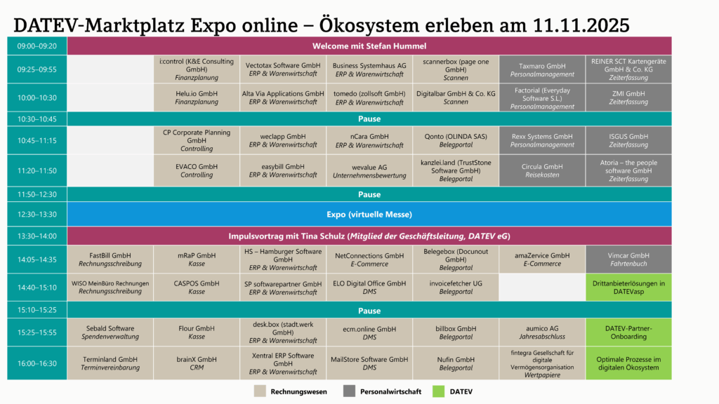 Welche Unternehmen ihre Lösungen am 11. November auf der DATEV-Marktplatz Expo vorstellen, finden Interessierte in der folgenden Übersicht: