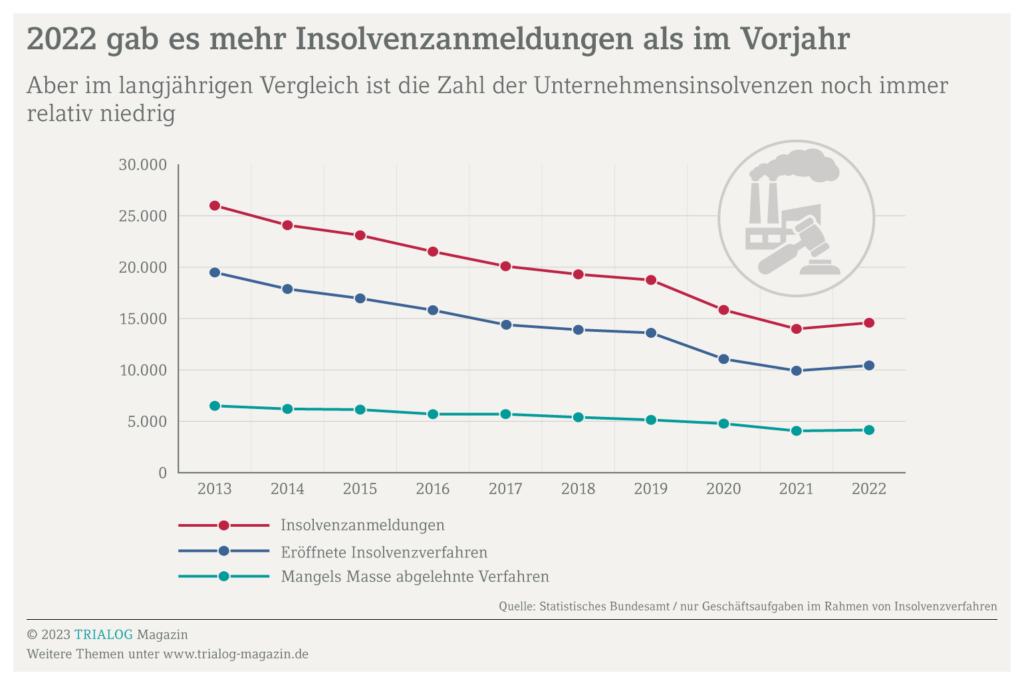 Die Zahl der Firmeninsolvenzen steigt. 2022 wurden 10.432 Insolvenzverfahren eröffnet, fünf Prozent mehr als im Vorjahr. Doch nicht alle Unternehmen verschwanden vom Markt, denn das Insolvenzrecht eröffnet im Insolvenzfahren die Chance auf Sanierung. Mitunter sogar zur Insolvenz in Eigenverwaltung, bei der die Geschäftsleitung weiter amtiert. Das Insolvenzrecht erlaubt es zahlungsunfähigen oder überschuldeten Firmen, im Insolvenzverfahren … Weiterlesen
